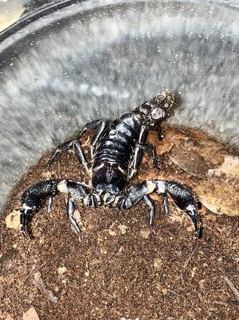 Asian Forest Scorpion (Heterometrus spinifer) I have a female Asian Forest Scorpion. Low maintenance, easiest pet to keep. Feeds only once a week. Comes in plastic container. tag: scorpion,...