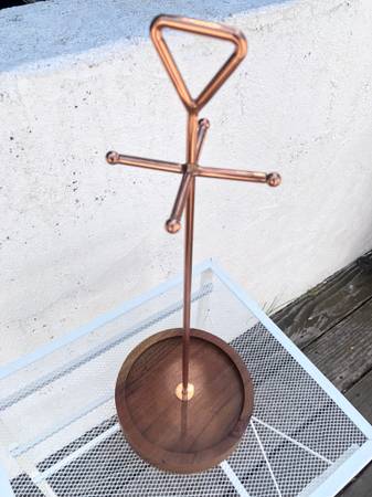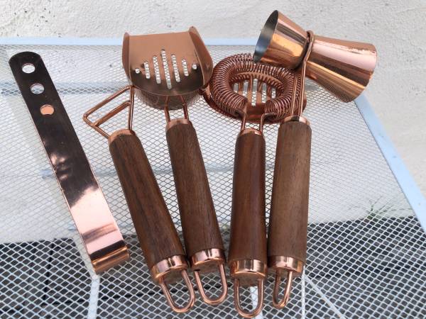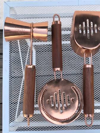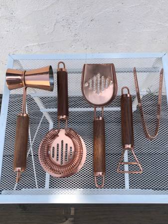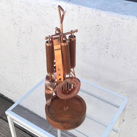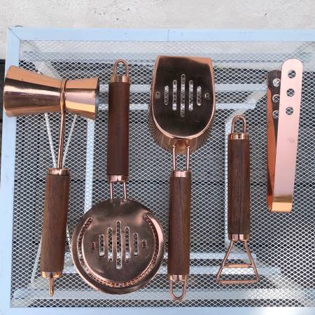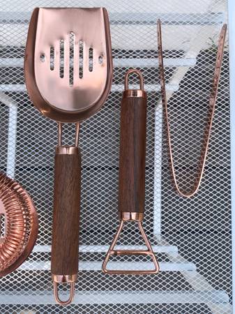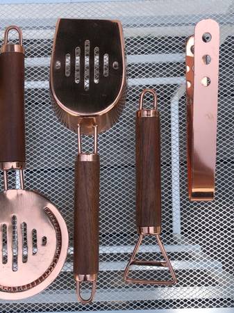 This is a stylish Project 62 Bar Tool Set featuring 5 pieces in a Mid-Century style. The set includes a Measuring Cup (2 Sizes), Strainer, Tongs, Bottle Opener (cap), and Ice Shovel, all in Brown Bronze. Made of Wood and Metal, this bartender kit comes with a stand for easy organization. It is designed for all occasions and requires hand washing. Created in India, this set adds a touch of sophistication to any bar setup.