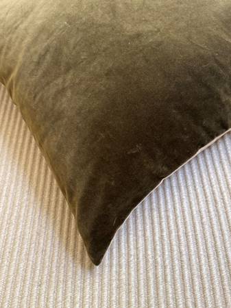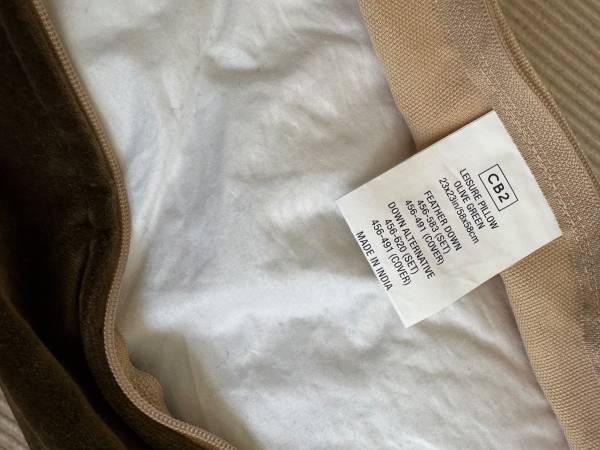 CB2 olive green pillow cover and alternative down feather inserts. Final sale. CASH ONLY $40. Hollywood/ West Hollywood area. Must collect. Size: 23 x 23. 100% cotton shell and lining