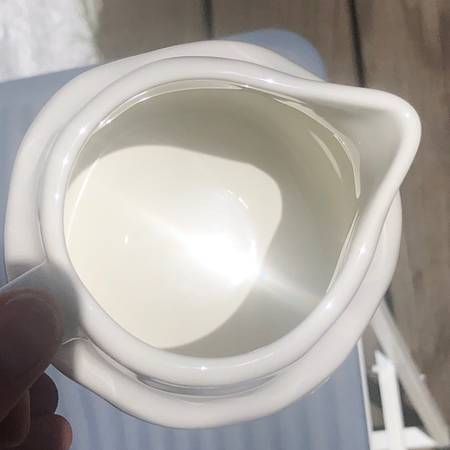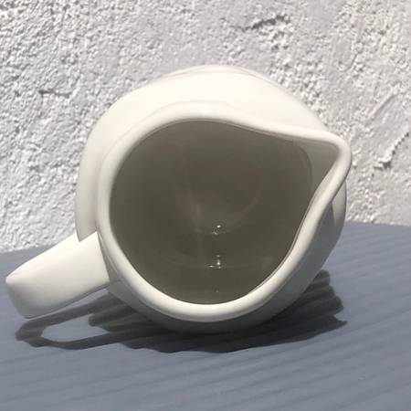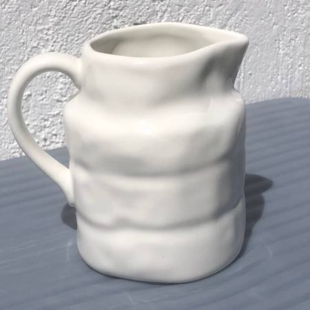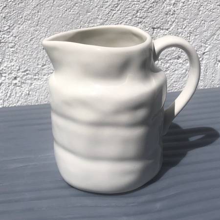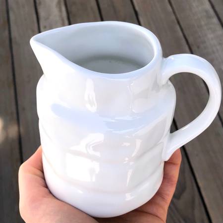 - This vintage style of this white pitcher makes it a classic for your kitchen. There is a soft ripple design throughout. The spout has a V shape which allows for controlled pouring of your liquids.