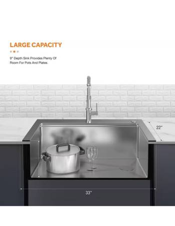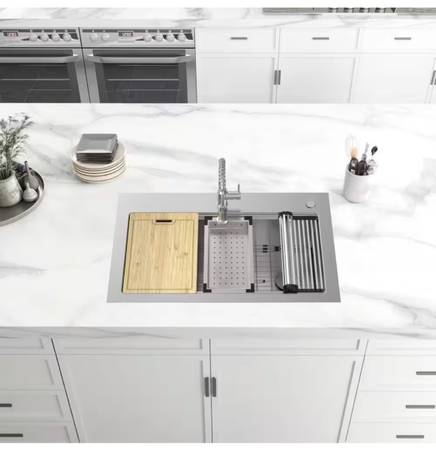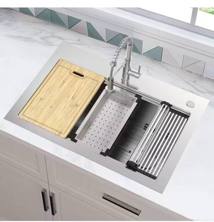 Double ledge workstation sink can maximum the countertop space by sliding the accessories and provides efficient multitasking: interchangeable multiplatform capability