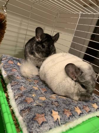 I have a White Mosaic Male Chinchilla & a Black Ebony Female Chinchilla available. I want to make sure they go into a good home and with someone who knows how to take care of them preferably if you’ve already had chinchillas. There’s a rehoming fee of $500 for both chinchillas together but it also includes a 5 story cage on wheels, an exercise wheel & all other accessories with the cage.