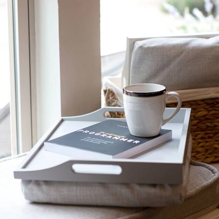 Detachable Cushion with Washable Cover: This tray comes with a detachable, easy to wash cushion that snaps to the tray. The neutral-colored cushion conforms to your lap and makes working, eating, writing, and other activities comfortable in any seat in the house.
