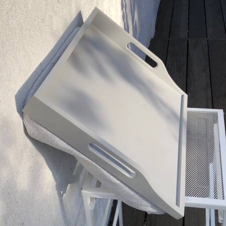 Sturdy Wood Construction: This soft, neutral gray wood tray is solid and durable. The gray surface is an elegant neutral complemented by the light colors of the detachable cushion.