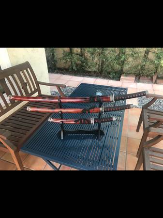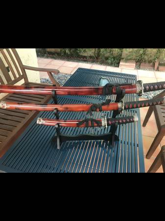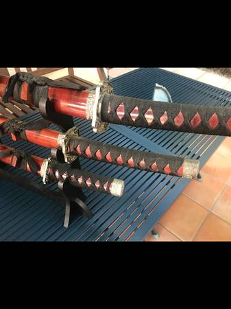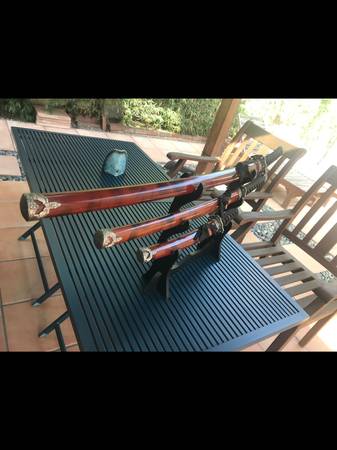 Samurai Sword Set, 3 pieces, 20", 30" 38", with stand. Exactly as pictured, like new. Located Atwater Village, 90039 Call, no texts: 323-667-222two