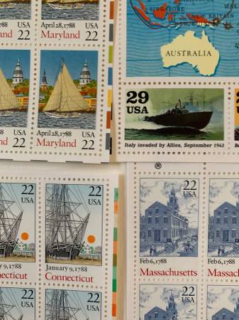 Over $300. face value of U.S. postage stamps. 29 Full sheets of Commemorative Stamps, 40-50 per sheet, significantly discounted. Remember stamps? They still work, many different images - Roberto Clemente, Space Missions, Smokey the Bear, MacGruff the Crime Dog, Folk Art, Wildlife, Quarterhorses, U.S States, sports figures.