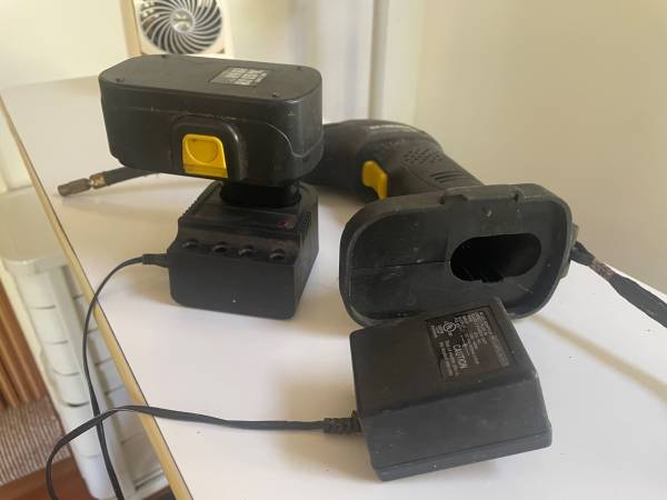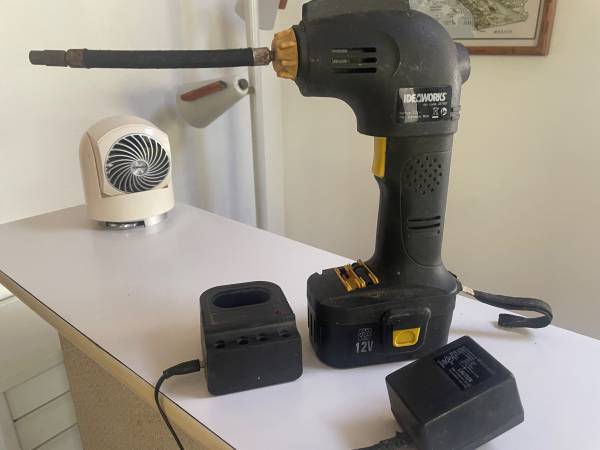 Battery powered tire inflator. 12 volt battery. Comes with charging station. Works great, I just bought a smaller inflator.