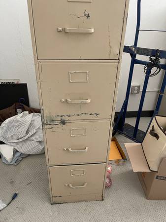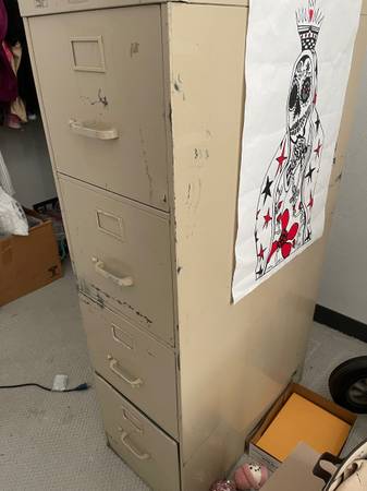 Beautiful in its own grungy way 4 drawer file cabinet that will never die. 54" H x 28" D X 15" W comes with all of the bars to hang files. I will throw in the poster by Lt. Mustardseed if you like it.Apparantly these are valuable now. One is going for $1400 on ebay. WOW!