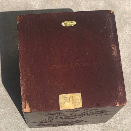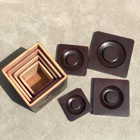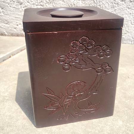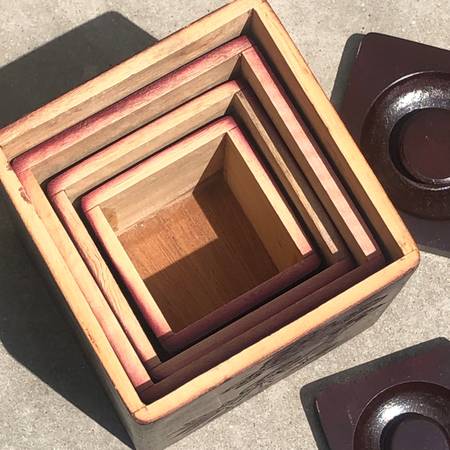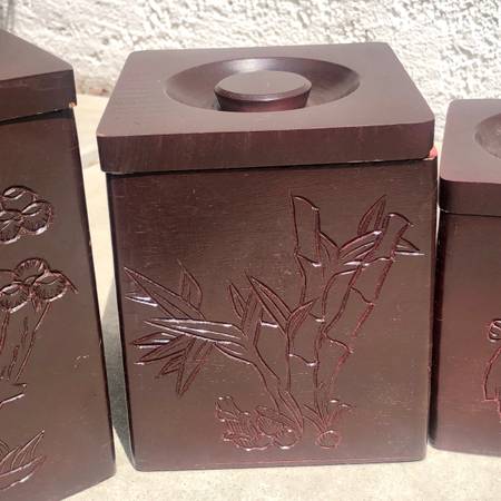 This vintage wood nesting canisters set of 4 features a traditional Asian design, with intricate hand-carved details and a mahogany wood tone. Each canister is rectangular in shape, medium in size, and comes with a lid for secure storage. Perfect for storing kitchen essentials or as collectible items, these handmade canisters are both functional and decorative. With a vintage retro style and nature print pattern, this set adds a touch of elegance to any space, making it a unique and charming addition to your home.