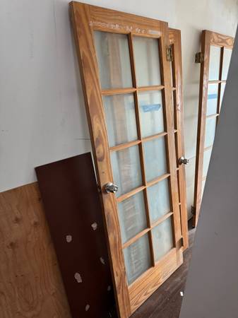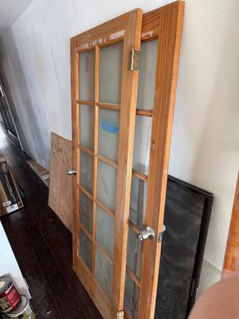 2 wood and glass doors available. No door frames. They are basically builder grade- they don’t have the hinges routed in so you can swap out the hinges. They were used as a bedroom and bathroom door in my house that I’m remodeling. They still have plastic on every pane of glass- not sure if it’s for privacy or the manufacturer protection for the glass. These doors are in good condition but could use a sand and stain or paint. Doors like this typically sell unfinished for $300+, yours for only $100. They are priced to sell, first come first served. Call or text show contact info