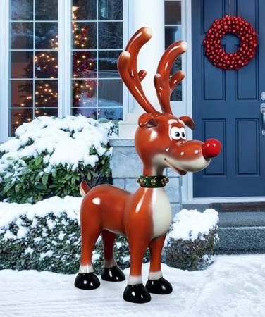 While Rudolph and his reindeer crew are delivering worldwide, Santa's Second Team is waiting in the wings for their Christmas chance. At nearly five feet high, our friendly and a bit goofy Jolly Holly reindeer sculpture will make your heart glow leading your holiday decorations. Design Toscano has cast this red-nosed reindeer Christmas statue in quality fiberglass reinforced designer resin, and then hand-painted it one piece at a time with authenticity from reindeer jingle bells neck bling, to bright red reindeer nose. From your entryway to along side the Christmas tree, this holiday helper is St. Nick's favorite and always in the mood for festive fun! Simple assembly required. 42"Wx22"Dx59"H. 31 lbs.