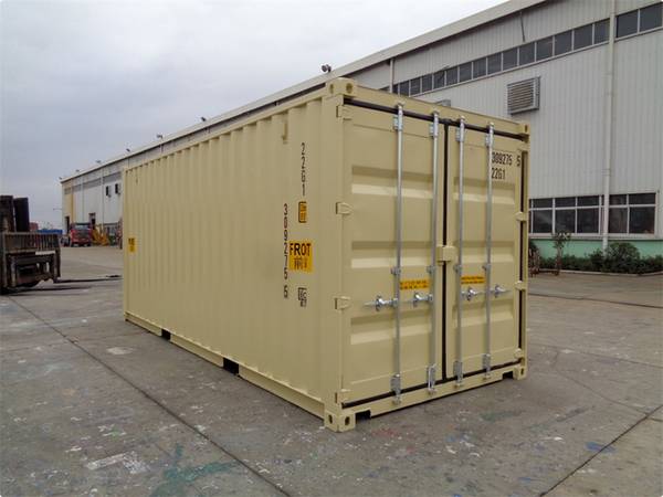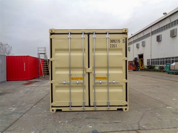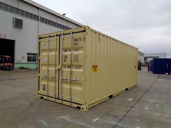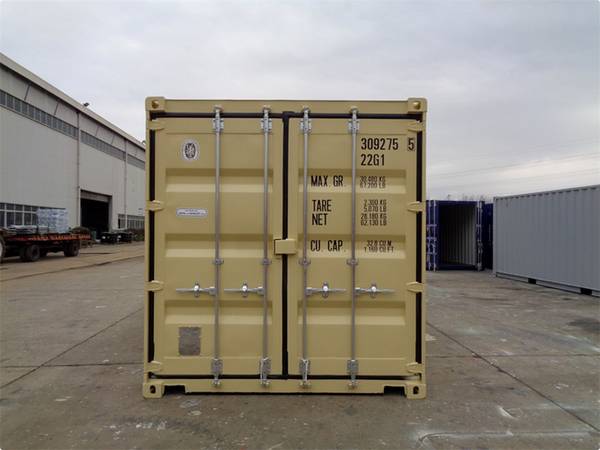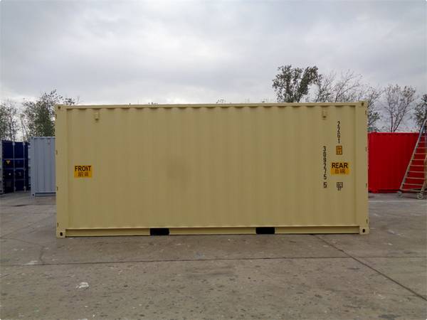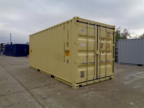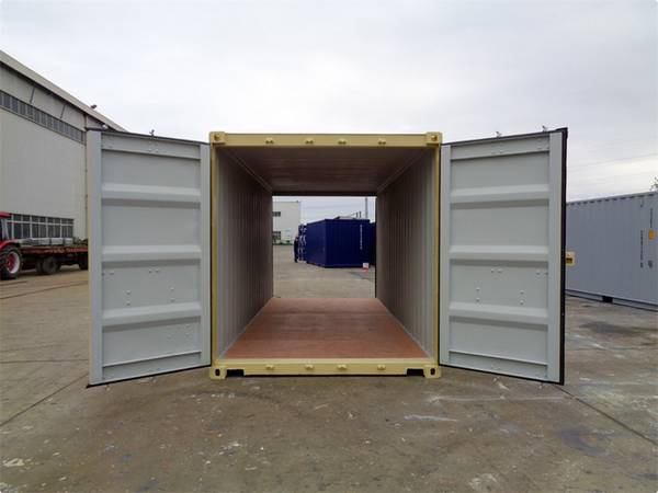 20-foot shipping container in RAL 1014 (ivory/light beige), equipped with double doors on both ends for convenient access. In excellent One Trip condition, built for strength and security.