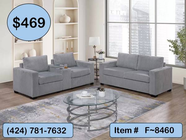 F~8460: Light Gray Sofa w/ Cup Holders & Console + Love Seat ~ $469
