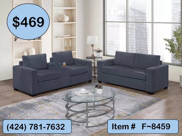 F~8349: 2 Pcs Smoke Gray Sofa & Love Seat w/ USB Charging Cup-Holder Console ~ $469