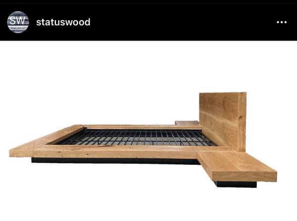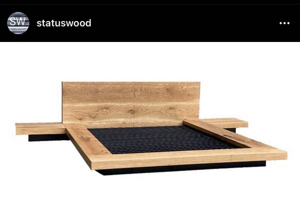 White oak king size bed. Custom sizes and designs available www.Statuswood.com Custom, bed, live edge, walnut, slab, bedroom, interior design, home decor, night stand, industrial