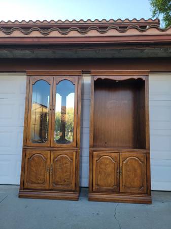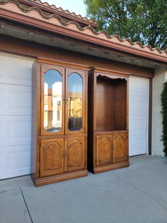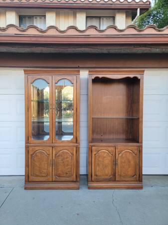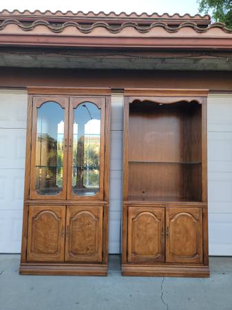 Beautiful pair of contemporary modern wood Thomasville cabinets with glass shelves, perfect for your house, apartment, livingroom, office, studio, library etc. in good condition, available for sale now, for question contact at Efrain. at cell. phone number. show contact info