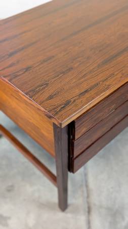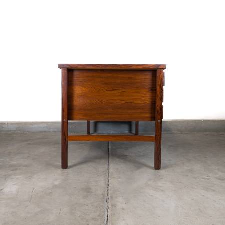 🌹 Sleek and Classic 🌹 Just in, a beautiful Danish Rosewood desk, c1970s. Refinished and in excellent condition. Measure approximately 55.5"W x 28.5"D x 28"H. Lovely grain throughout. Features 3 drawers on the left hand side and a large filing cabinet on the right. Perfect for a boss like yourself.