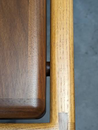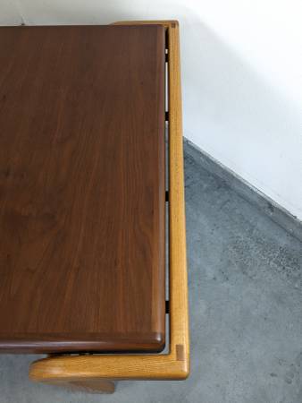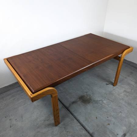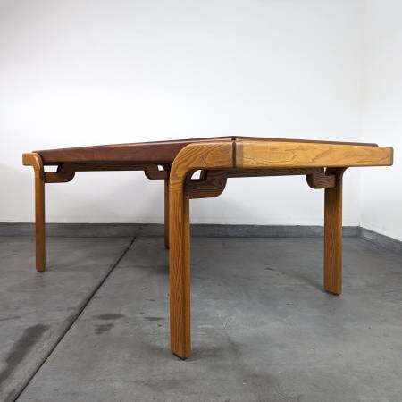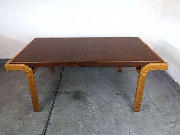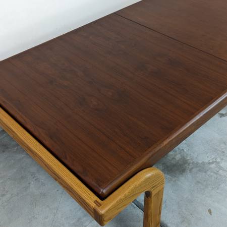 Elevate your dining room with this exquisite vintage dining table, a testament to the unparalleled craftsmanship and innovative design ethos of the 1970s. Believed to be a custom piece from the studio of renowned designer Lou Hodges, this table embodies the spirit of California modernism that Hodges and his California Design Group championed during their heyday. Expertly refinished to showcase its original glory, the table features a stunning walnut top complemented by structurally curved oak legs, a harmonious blend that highlights the beauty of mixed woods. Measuring an impressive 80"L x 41.5"W x 31"H, with a leaf that extends the table an additional 24" to a total length of 104", it effortlessly accommodates large gatherings, making it an ideal centerpiece for any dining space.