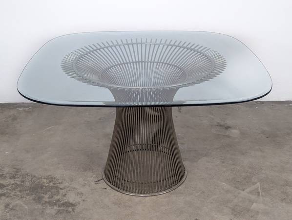 Just in, an amazing dining table designed by Warren Platner for Knoll, c1970s. Sourced from the original owner's estate. Features patinated Nickel finish that can only be achieved with time. Original glass was replaced to accommodate dining room area where it was used with club chairs. Measures approximately 47.75 x 47.75 x 28.5. DM to view original set up