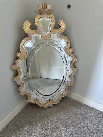 Vintage Murano Venetian Beveled Mirror Clear with Gold background Measures: 36" tall x 22.5" wide x 1.75" depth
