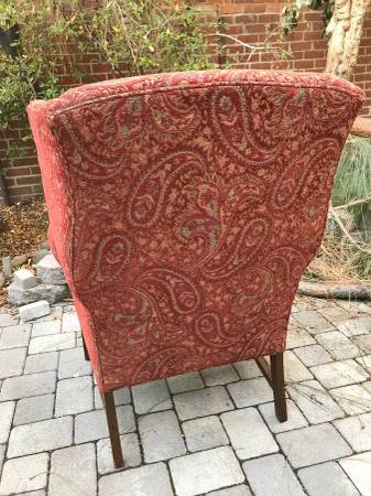 Beautiful upholstered armchair / sofa chair / accent chair / vintage wingback chair in like new condition. Beautiful colors. Very comfortable. Great reading chair. Elegant. Solid dark walnut wood...
