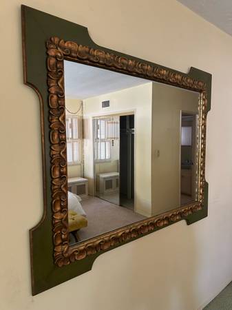 Large mirror / vintage mirror. Detail is amazing. Colors are gorgeous. Stunning piece. Solid wood frame. Hanging hardware attached. Can deliver for a fee. 60” long by 48” wide