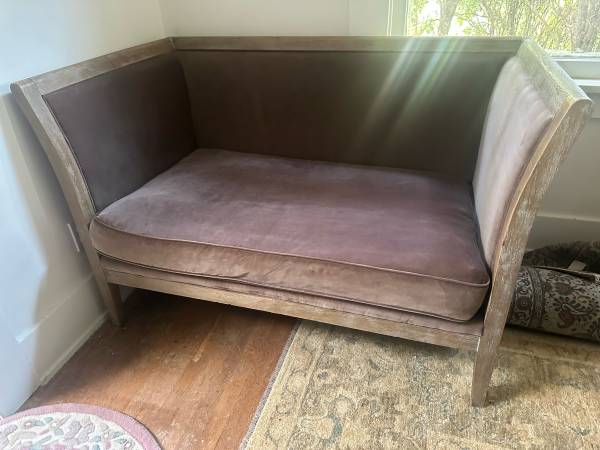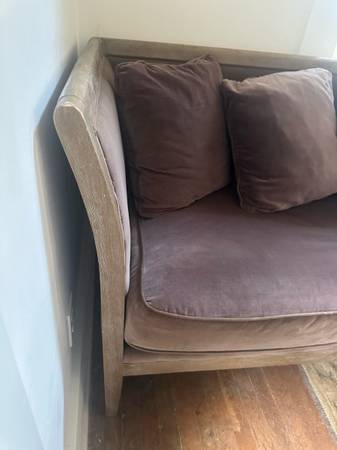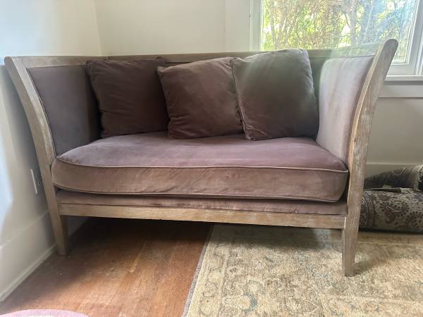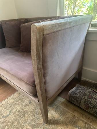 Velvet mauve upholstered loveseat. Smoke and pet free home. No rips, stains, or discolorations. Gently used. Can deliver for a fee. 30” deep by 51 3/4” long 33” tall