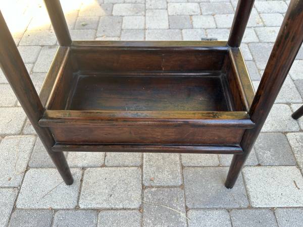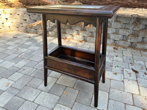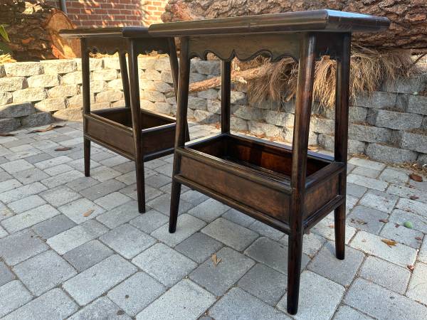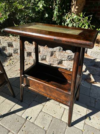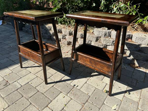 Unique pair of end tables with bottom shelf and stone tops. Well made. Heavy. Sturdy. Can work as end tables / side tables / night stands. Excellent Condition. 14” deep by 23” wide by 30” tall