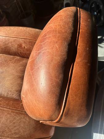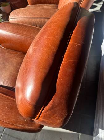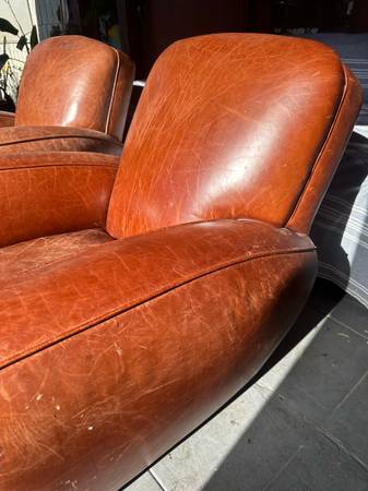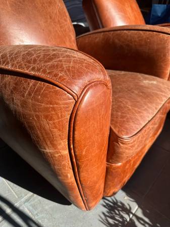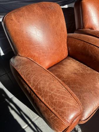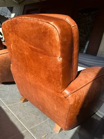 Leather sofa chairs. Thick leather. Tear on the back side of one (refer to photo) otherwise no tears. Incredibly comfortable. Robust and statement chairs perfect for a lounge room, library, or...