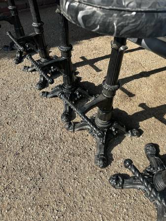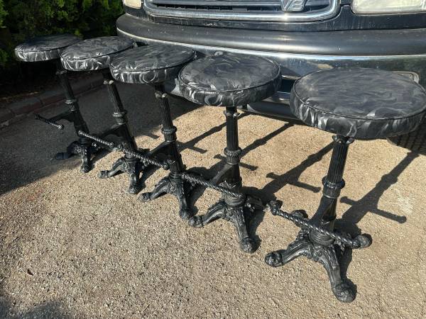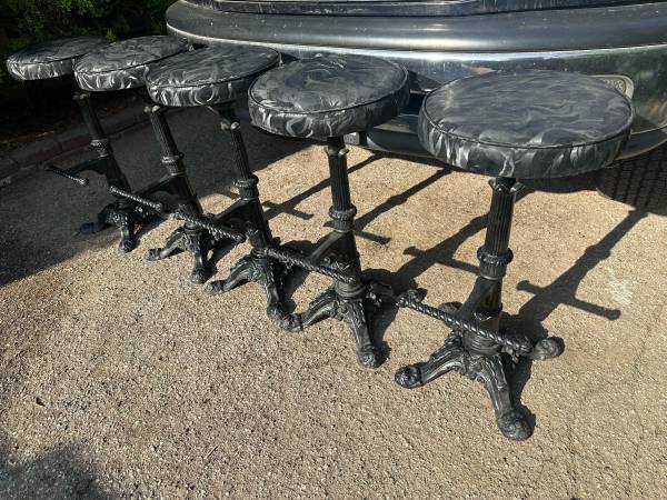 Set of five vintage bar stools with cast iron bases / vintage stools / cast iron bar stools.