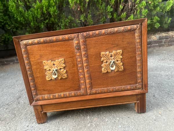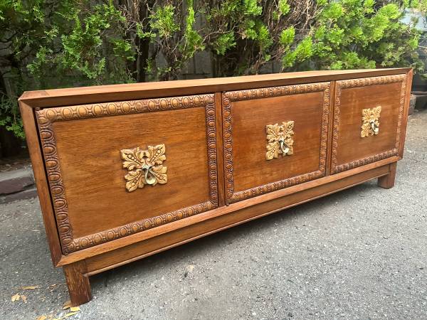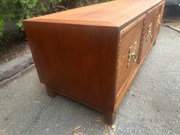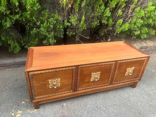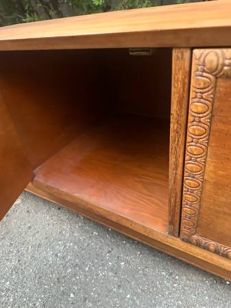 Cool mid century living room set with an end table / cabinet and console table / tv stand / mid century cabinet with decorative doors.