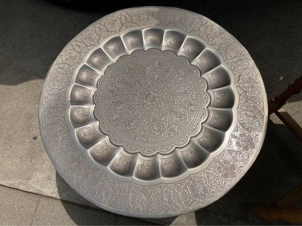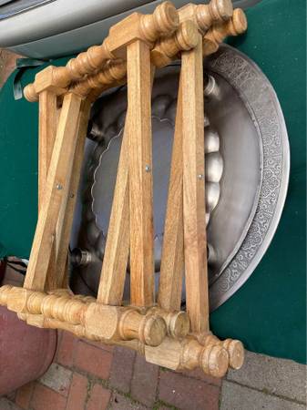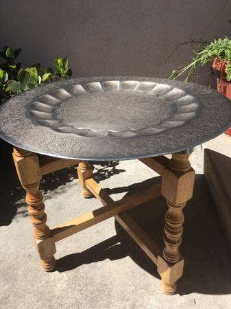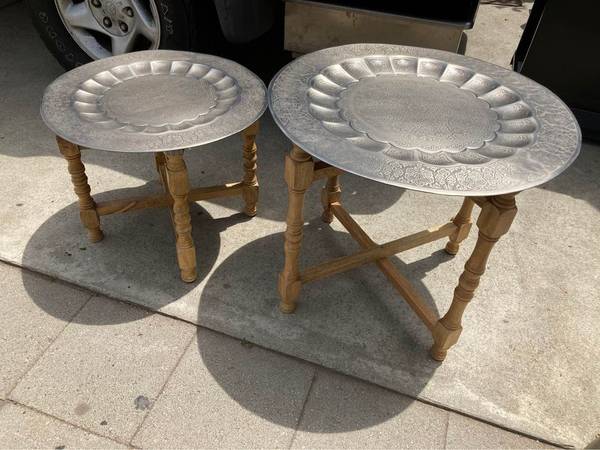 Pair of serving tables in excellent condition. Made in India. Hand crafted. Heavy stainless steel top. Fold up nicely to save space. Dimensions: larger serving table / end table: 25” diameter and...
