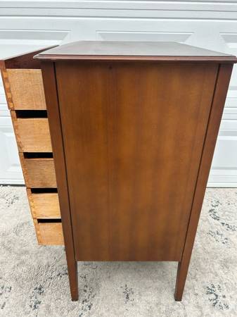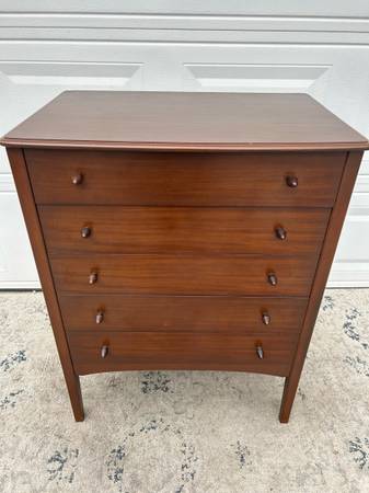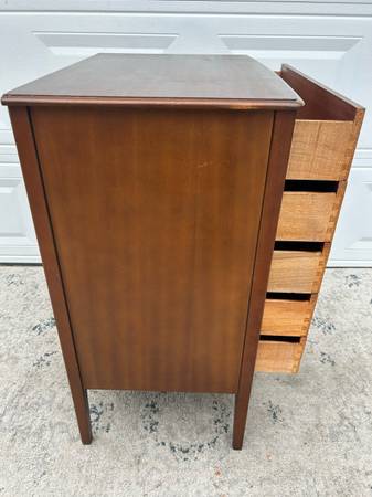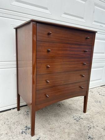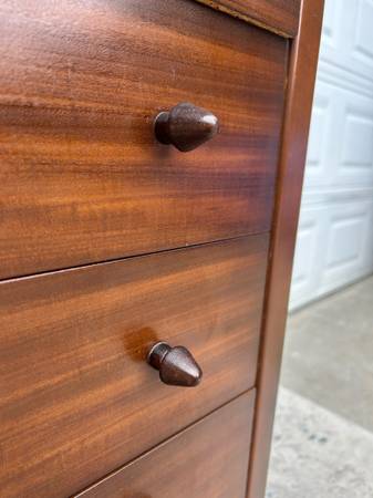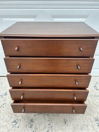 A minimalist mid-century piece featuring five dovetailed drawers and distinctive cone-shaped handles. Clean lines and functional design make it both practical and stylish. Imported from England, this tall chest is a unique example of 1960s craftsmanship.