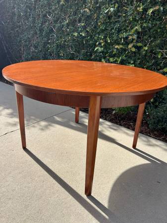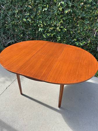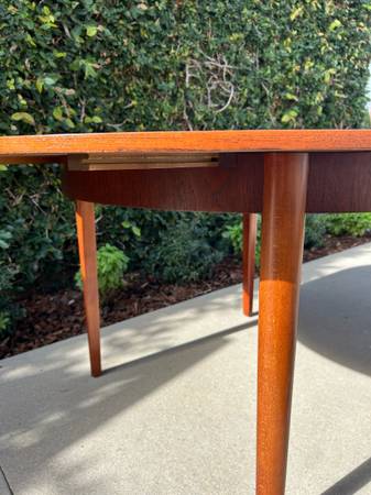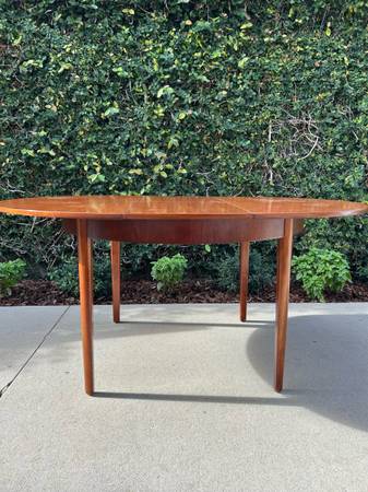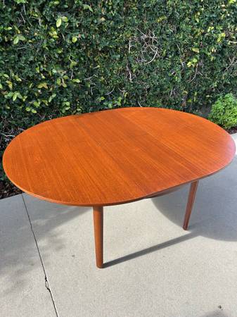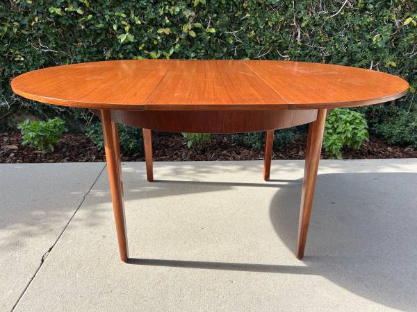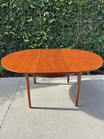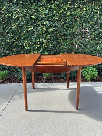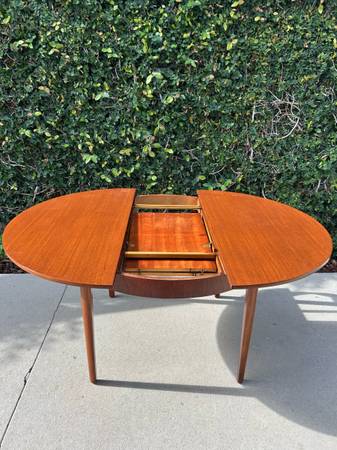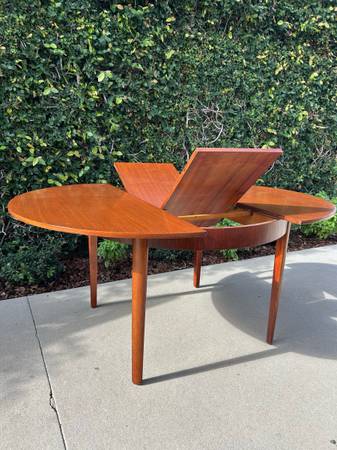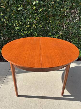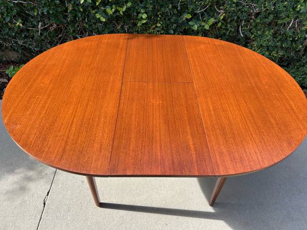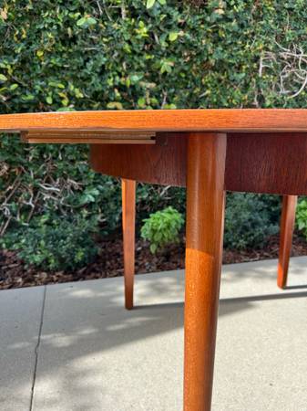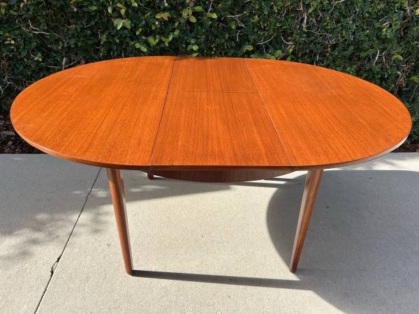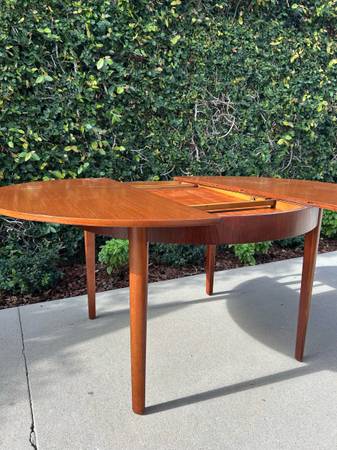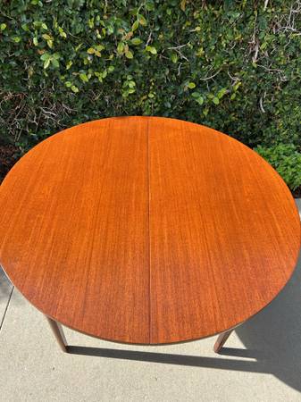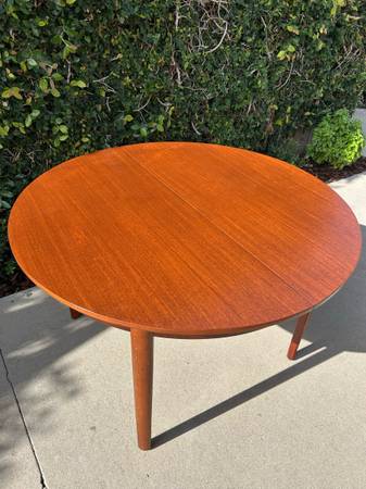 Item #AAZ74 Danish modern round teak dining table, professionally refinished. 1960s design, imported from the UK. Features an extending butterfly leaf for added seating. Beautiful mid-century craftsmanship.