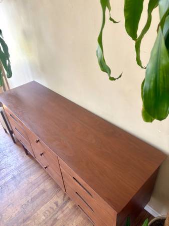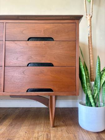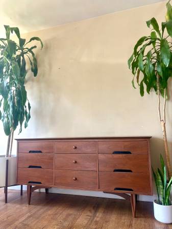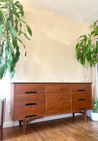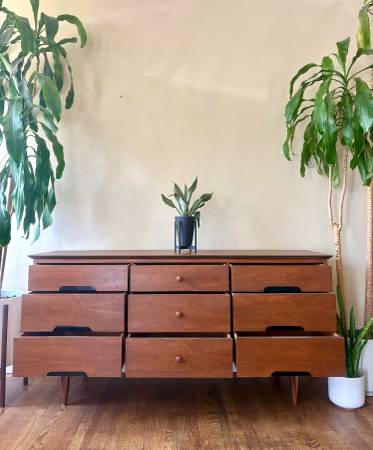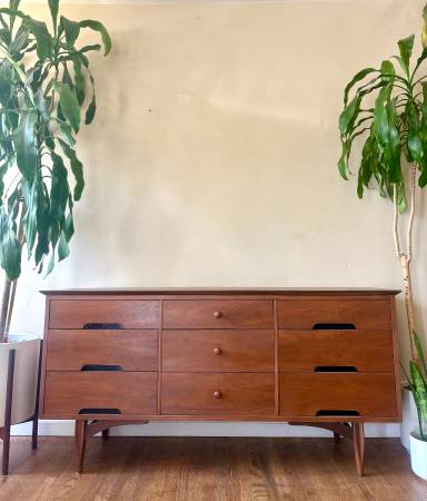 ON SALE NOW!! Gorgeous MCM Designer Dresser made by Morris Furniture. Beautifully crafted, made of solid Walnut, This lovely dresser’s an ideal option for smaller spaces! She has 9 drawers for storage, beautiful, tapered legs, and a sexy design!💋 Professionally refinished! Matching Nightstands available!!