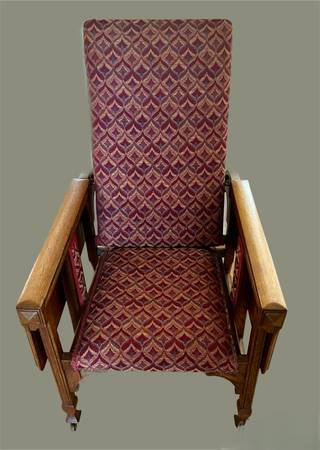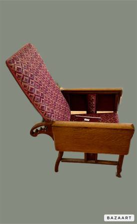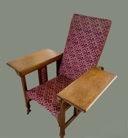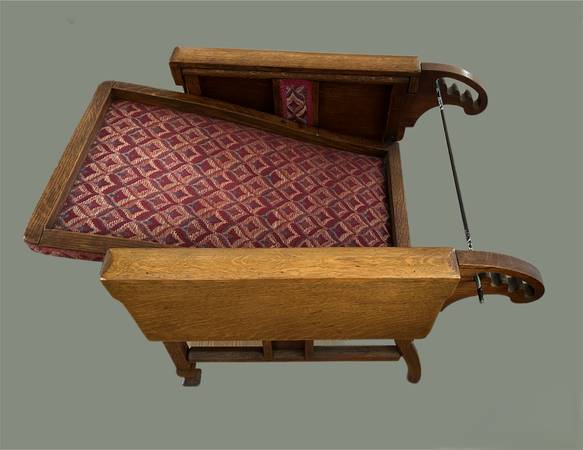 Vintage George Hunzinger, Oak Morris Chair with Folding Arm Rests. One of Hunzinger’s many patented mechanical furniture designs. Late 19th century.