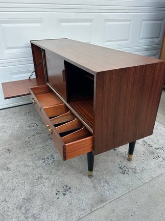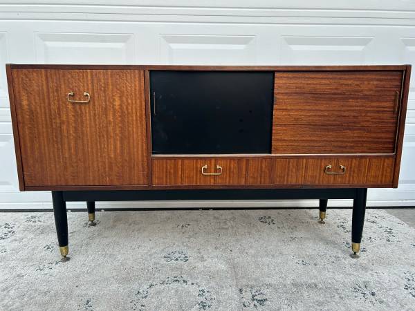 Mid-century credenza by E. Gomme Ltd of London, dating from the 1950s. This elegant piece features two sliding doors—one in ebony and one in teak—with a shelf inside for versatile storage. It also includes a drop-down door revealing an additional shelf, along with two dovetail-jointed drawers complete with dividers. The credenza sits on a striking ebony base. A matching armoire is also available.