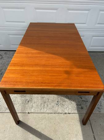 Beautifully crafted Mid-Century Modern draw-leaf dining table made from high-quality teak. This vintage piece features an expanding top that extends from 48” to 87” in length, with leaves that pull out smoothly from beneath the main tabletop to accommodate additional seating. A stylish and functional addition to any modern or retro-inspired space. Imported from the UK.