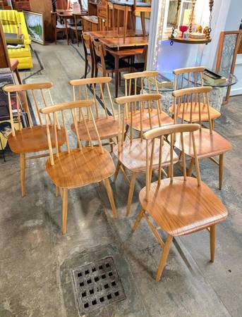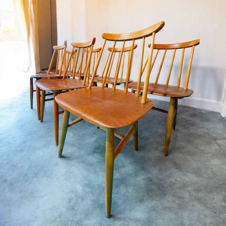 Beautiful Set of"Fanett” model chairs designed by Finnish designer Ilmari Tapiovaara for the edsbyverken house in the 1950s. They feature a birch construction with bent teak seat. Perfect vintage condition.