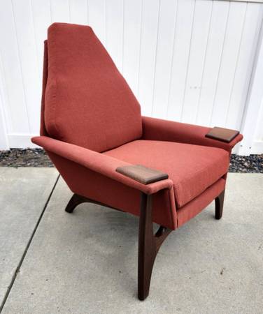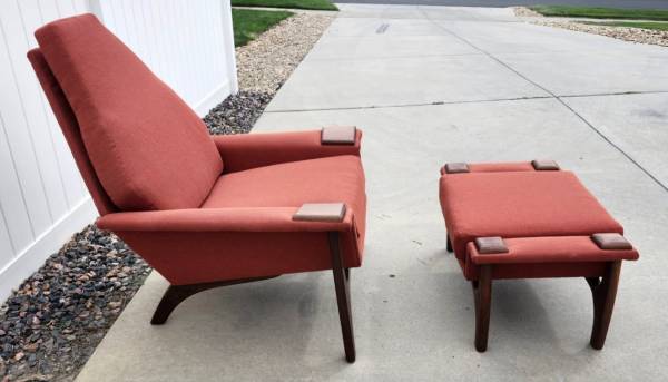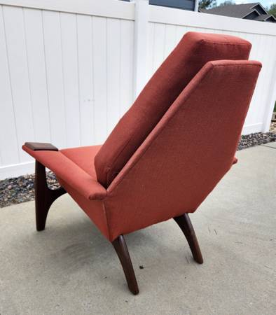 Stunning Craft Associates Mid Century Lounge Chair and ottoman designed by Adrian Pearsall. High back version of the 2307-C chair. Newly reupholstered. In Excellent condition! Stunning solid walnut legs and accent pieces. Very comfortable. Fabric is orange/red color that will go with nearly anything. Pictures do not do this piece justice.