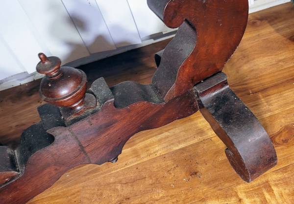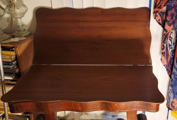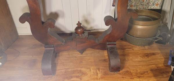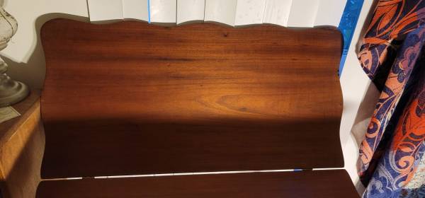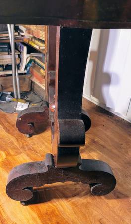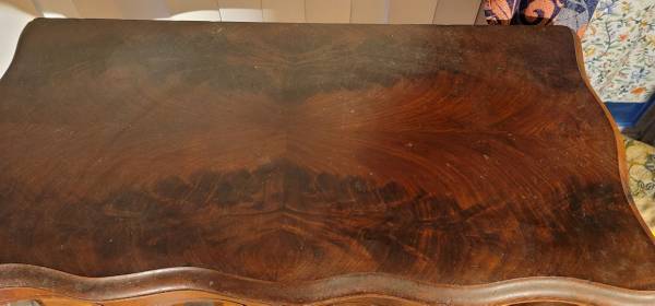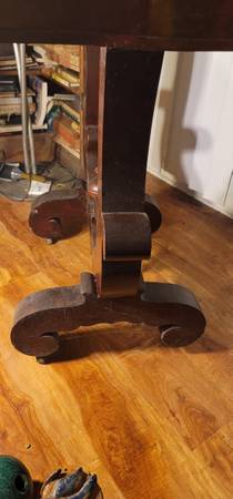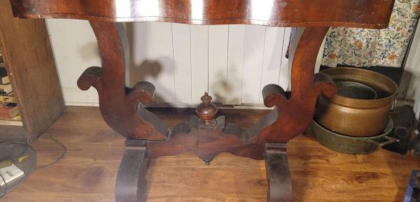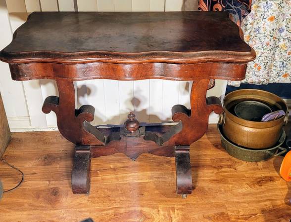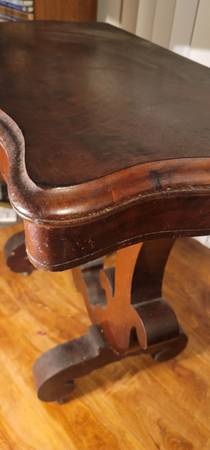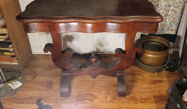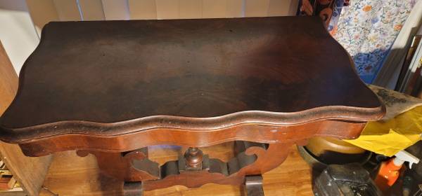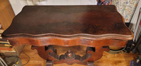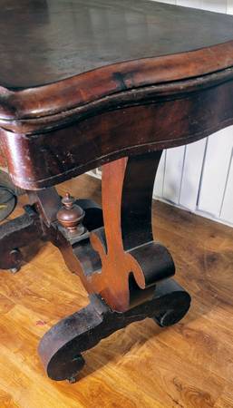 I LOVE this Game table but no longer have a place for it. 1800s burl walnut veneer on top. Curved wave front; pillar and scroll bottom. top is 16 inch X 34" X 29" high. Excellent for its age. Top opens and turns, for game table. The wood peg on which the top turns is missing; so it opens manually. The bottom has been reglued. Good side entrance table. It is photographed with back light. Expert Estimated value to $6,500. Connoisseurs like antiques in original condition.