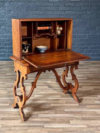 This antique American Victorian secretary desk showcases exquisite craftsmanship with its intricate scroll-cut base, carved floral medallion, and richly toned walnut and mahogany woodwork. The drop-front panel opens to reveal multiple storage compartments, perfect for writing essentials or cherished keepsakes. Original brass hardware, including a functioning skeleton key, adds timeless character and authenticity to the piece. The patina and detailing reflect the elegant sensibilities of early 20th-century American furniture design. A graceful blend of beauty and practicality, this desk serves as both a functional workspace and a decorative statement.