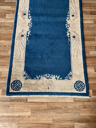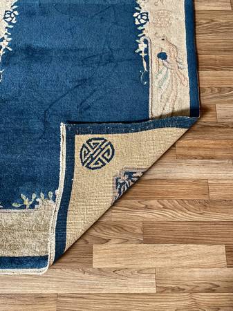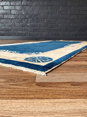 This hand-knotted wool rug from 1920s China showcases the refined simplicity of Chinese Art Deco design. A deep blue central field is framed by a soft cream border, accented with stylized peacocks and traditional longevity medallions in each corner. The minimal, open layout emphasizes balance and symmetry, making it a versatile statement piece for both classic and modern interiors. Its rich color palette and elegant composition reflect the East-meets-West sensibility of early 20th-century Chinese export rugs. Presented in original vintage condition with age-appropriate wear that adds to its character and authenticity.