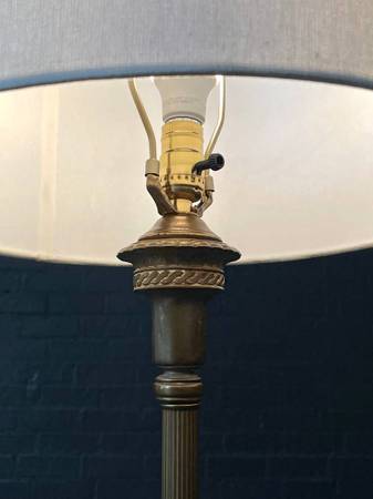 This striking French Neoclassical floor lamp from the 1930s features a refined combination of gilt bronze and richly veined onyx stone. The base is adorned with exquisitely cast winged caryatids, each standing on clawed feet and flanking the circular onyx platform with timeless elegance. A fluted column rises from the center, framed by classical bronze details and topped with a custom linen shade that diffuses a warm, inviting glow. The lamp has been newly rewired and fitted with a new shade, making it both functional and visually captivating.