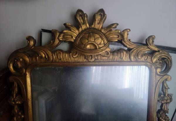 Antique Large Rocco heavy mirror, gold gilt, big carved wood frame, about 35 lbs. 44" X 31" Tahitian Red and Gold gilt over it. 1 inch thick- not flat-