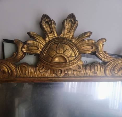 I think is George III Georgian early 1800s, vlist3d as alue $12,500 and; up. To $32,500, 15-20 urs ago. When I hang it, we put a nail in a beam. But there are "V" hooks with nails, that hold up to 50 lbs. Use 2 about 3-4 inches apart- all you will make is one small hole. Old Mirror glass was thick. the back has a piece of wood nailed in place. A great centerpiece for any room. Maker unknown. could be French, English, Italian, Or USA. Age but no damage on this frame. I bought this years ago from a couple leaving the state to retire who bought from local auction house.