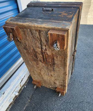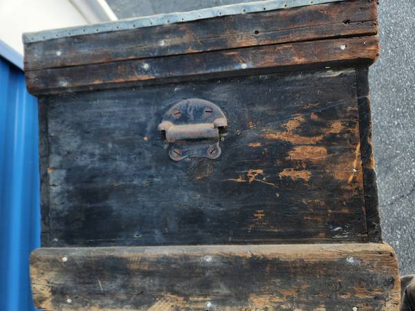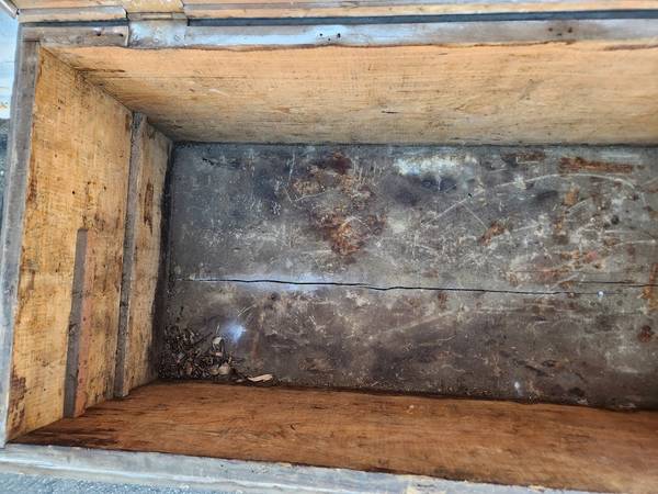 Antique Rustic Primitive Wood Rolling Carpenters Tool Trunk Chest w/Lead Metal Lid (?)