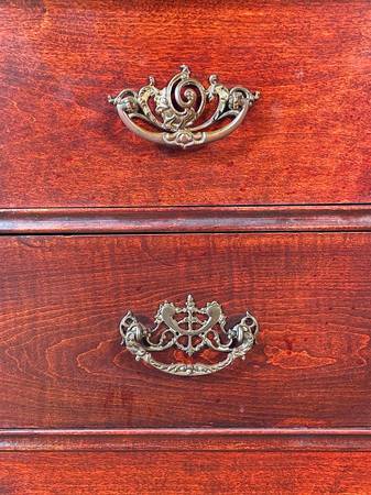 The cabriole legs, a hallmark of the period, add refinement and poise, while the ornate brass hardware features intricate Rococo-style designs reminiscent of 18th-century French furniture. With a blend of practical storage—three drawers and a side cabinet—this piece is both functional and stylish. A beautifully preserved vintage dresser, it is a statement piece that brings history, charm, and elegance into any home.