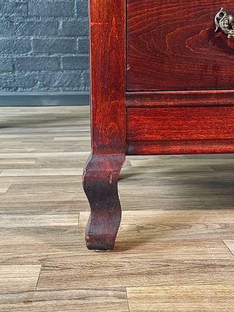 This exquisite American antique entry stand dresser exudes old-world elegance with its rich red-stained maple wood and gracefully curved serpentine front. The original pink marble top adds a luxurious touch, reflecting the European influence often seen in early 20th-century furniture. Delicate scrolling, leaf-like carvings on the corners, combined with the floral motif on the cabinet door, echo the ornate craftsmanship found in French Provincial and Louis XV styles.