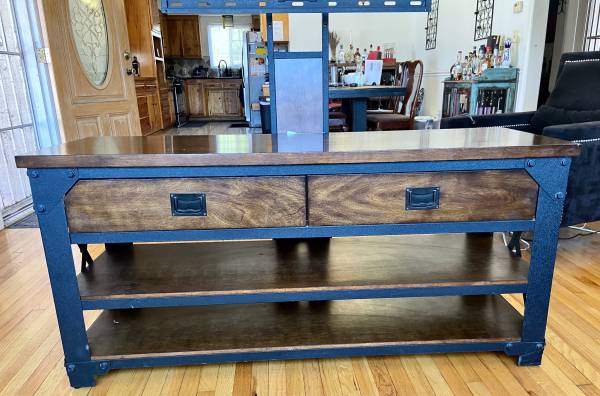 Bayside Furnishings Walton 56″ 3-in-1 TV Stand, proudly display and organize your DVDs, video games, remotes and other entertainment essentials on the sturdy vintage-inspired, metal-framed wood-shelving. For flat panel TVs up to 56″ and 134.9 lbs (NOT FOR USE WITH CRT TVS).